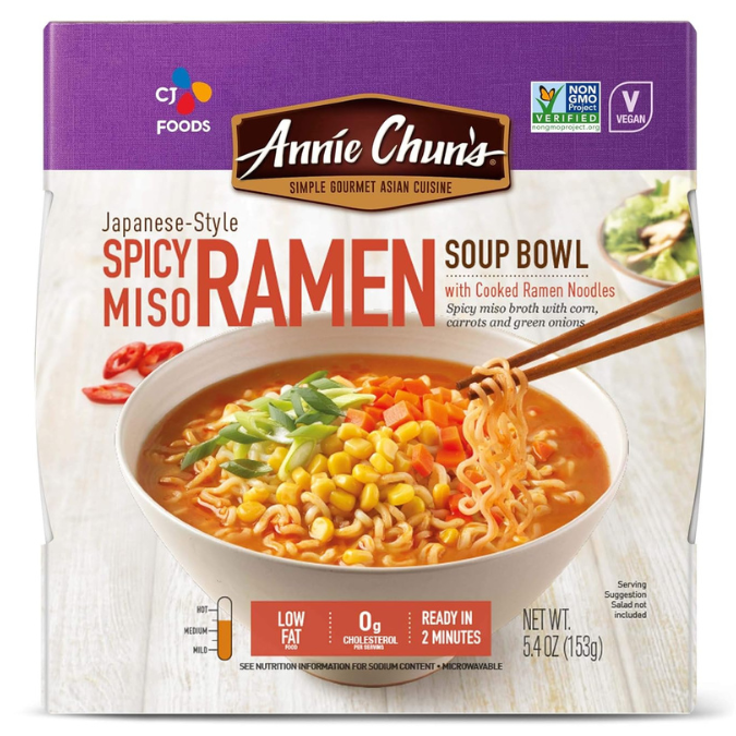 Indulge in Annie Chun's Noodle Bowl Chun's Spicy Miso Ramen Bowl, made with non-GMO and vegan ingredients. With a rich, restaurant-style spicy sauce and pre-cooked ramen noodles, this bowl is ready to eat in just 2 minutes. Satisfy your taste buds and nourish your body with this deeply flavorful and convenient option. Contains one 5.4-oz bowl.