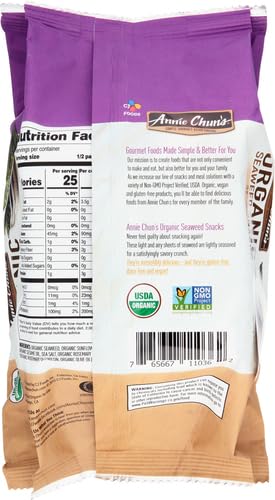 Indulge in Annie Chun's Snack Seaweed Sesame Organic, made with high-quality ingredients like Organic Seaweed, Sunflower Oil, and Sesame Oil. This one-sample pack offers a delicious, roasted snack with a hint of sea salt and organic rosemary extract. Gluten-free and perfect for any time of day.