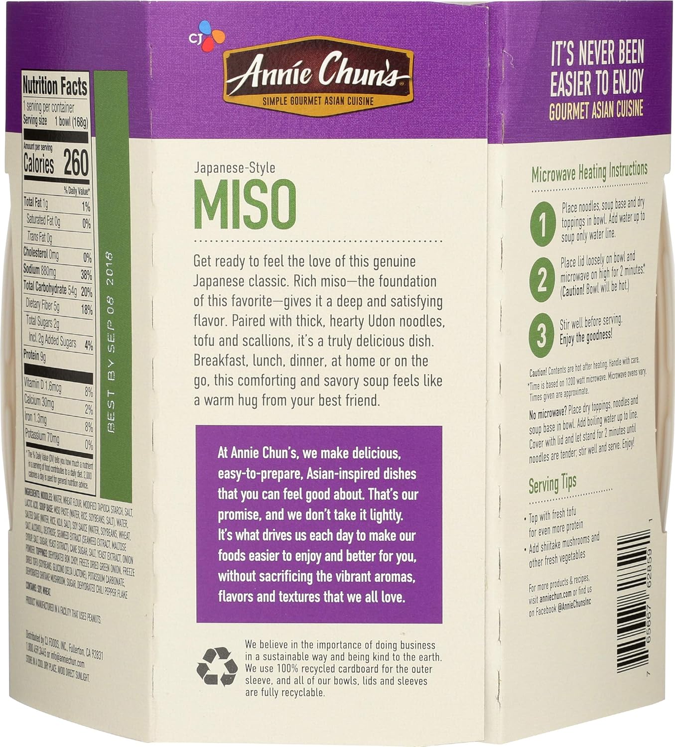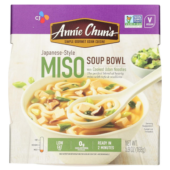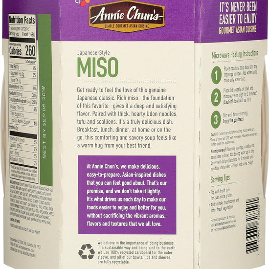 Annie Chun's Soup Bowl Miso is a flavorful and nutritious option, perfect for a quick and satisfying meal. Each 5.9 oz. bowl contains only 240 calories and 1g of total fat, making it a guilt-free choice. With 38% of your daily sodium and 8% of your daily iron intake, this soup bowl is a convenient and delicious way to meet your nutritional needs. Made with high-quality ingredients like wheat flour, seaweed extract, and shiitake mushrooms, this soup offers a balanced and tasty combination of flavors.
