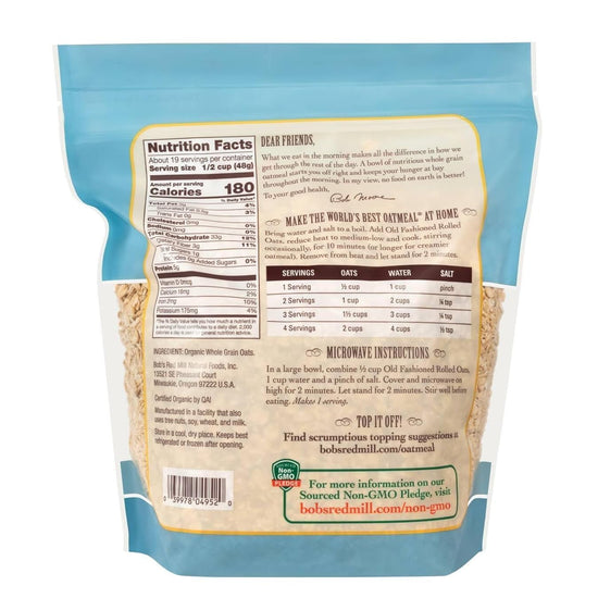 Experience a hearty and delicious breakfast with Bob's Red Mill Organic Old Fashioned Rolled Oats. Made from 100% whole grain oats, this non-GMO, vegan, and kosher cereal is a good source of fiber and protein. Versatile and easy to prepare in 10 minutes, it's perfect for hot cereal or as a crispy coating. Elevate your meals with Bob's Red Mill.