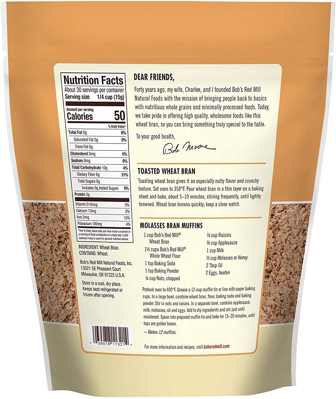 Bob's Red Mill Wheat Bran is a versatile and nutritious addition to your pantry. Made from natural wheat, it is a good source of fiber that can keep you feeling full and satisfied. This prebiotic also promotes healthy gut bacteria and aids digestion. Enjoy it toasted in hot cereals, baked goods, or as a topping for yogurt and smoothies. Non-GMO, vegan, and kosher.