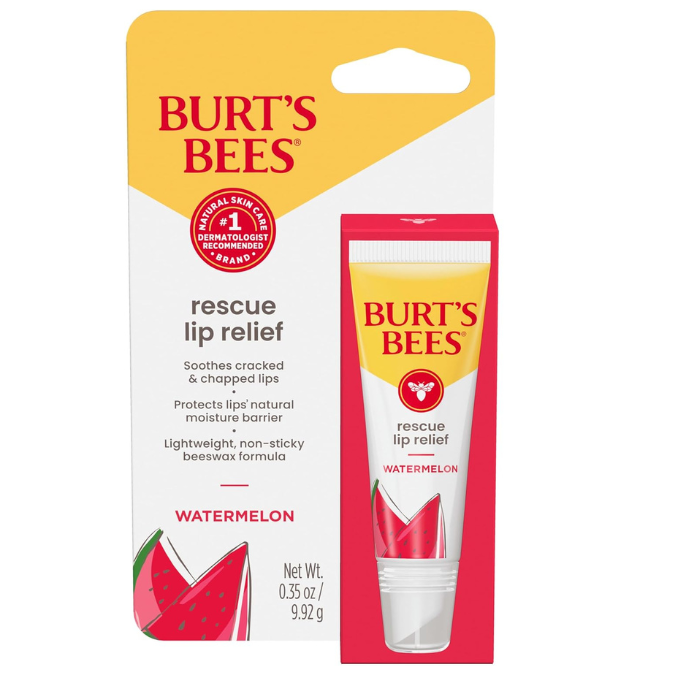 Enhance your lips with Burt's Bees Rescue Lip Relief in Watermelon. This 0.35oz hydrating lip balm is formulated with beeswax, shea butter, and cocoa butter to relieve extreme dryness and protect your lips' natural moisture barrier. The lightweight and non-sticky formula features a delicious watermelon flavor and is 100% natural origin, free of parabens, phthalates, petrolatum, and SLS. Keep your lips moisturized and beautiful with Burt's Bees Rescue Lip Relief.