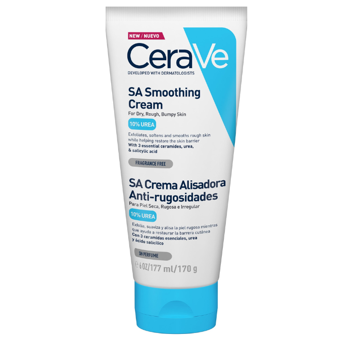 The CeraVe Smoothing Cream with salicylic acid eliminates dead skin cells, hydrates for longer, and reinforces the skin barrier. Its rich and enveloping texture leaves no residue and is suitable for body and face. With 10% urea and salicylic acid, it offers moisturizing exfoliation and the exclusive EMV technology protects the skin barrier.