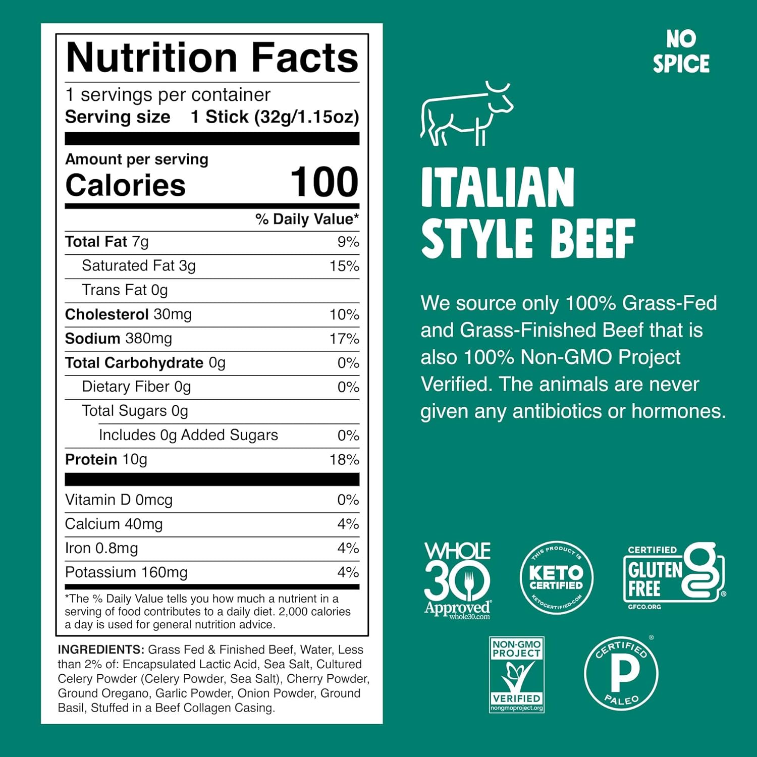 Experience the delicious, mild flavor of Italian meatballs with Chomps Grass-Fed and Finished Italian Beef Jerky Snack Sticks. With 10g of protein per 1.15oz stick and 0g of sugar, this convenient 10-pack is perfect for any occasion. Made with the highest-quality ingredients, including grass-fed and finished beef from cows and deer, and free from top 9 allergens, Chomps is a Keto Friendly, Whole30 approved, and Paleo snack option.