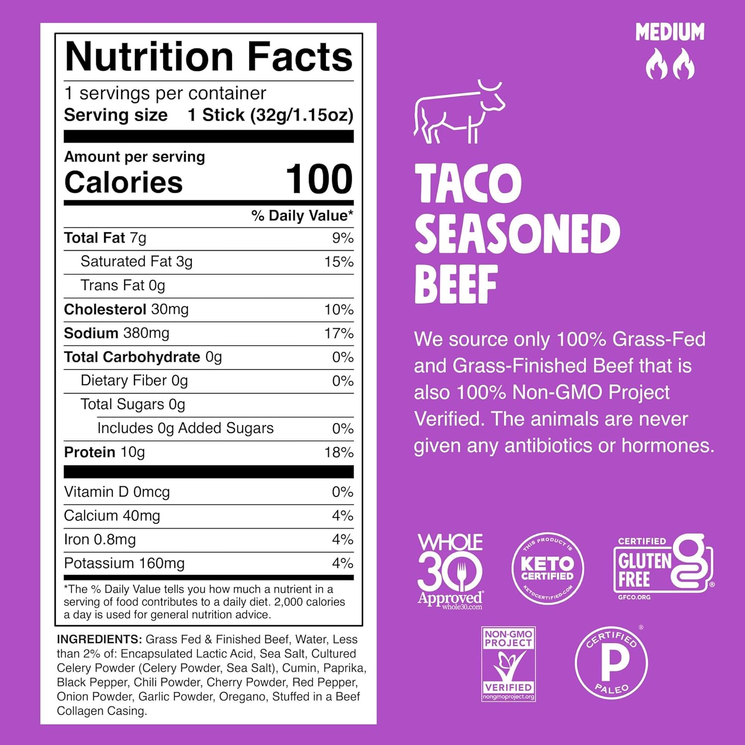 Chomps Grass-Fed and Finished Taco Beef Jerky Snack Sticks 10-Pack