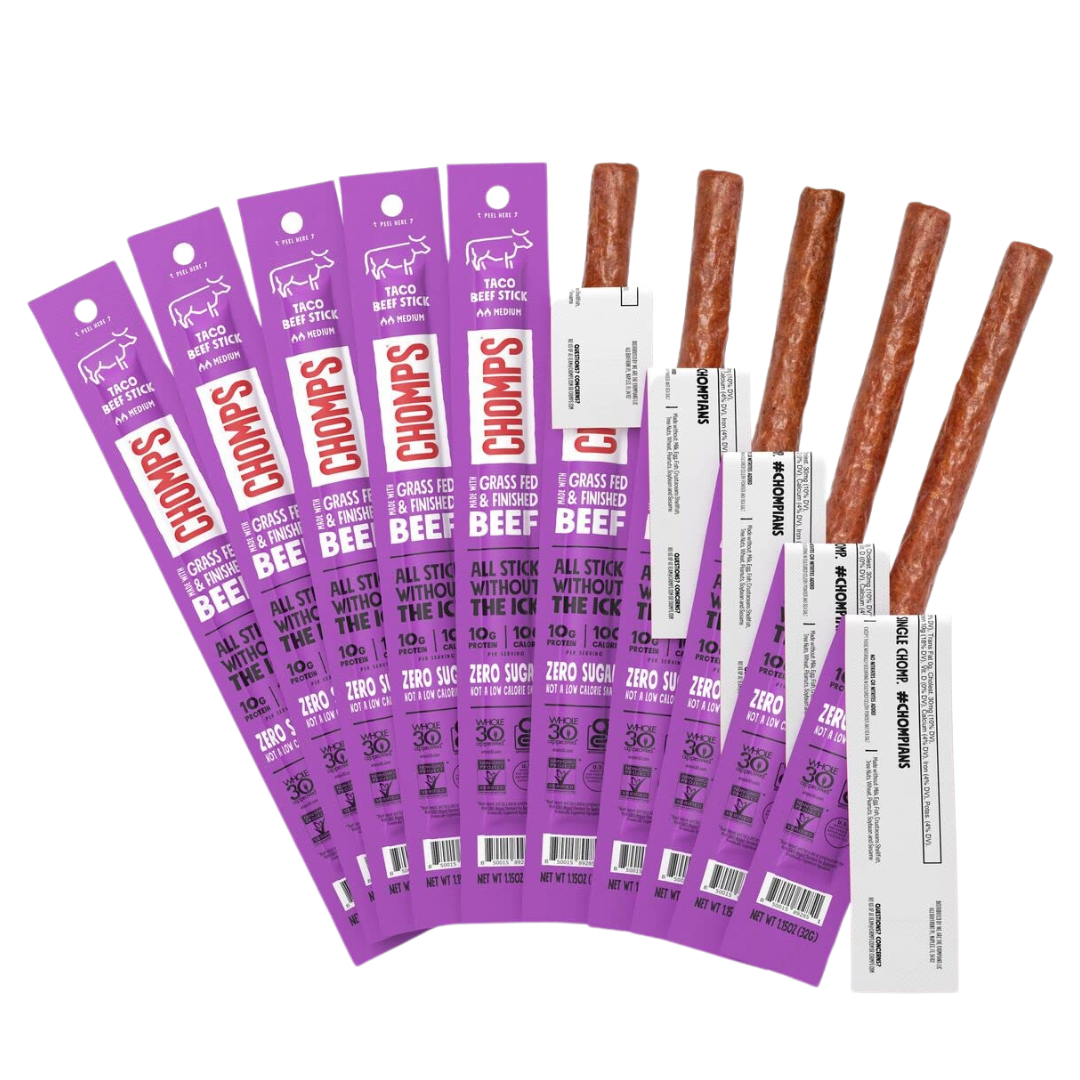 Satisfy your hunger with Chomps Grass-Fed and Finished Taco Beef Jerky Snack Sticks 10-Pack. Made with 100% grass-fed and finished beef, enjoy a convenient, gluten-free, and zero sugar snack that provides 10g of lean meat protein. As a minority-owned brand, Chomps is committed to delivering high-quality and healthy snacking options.