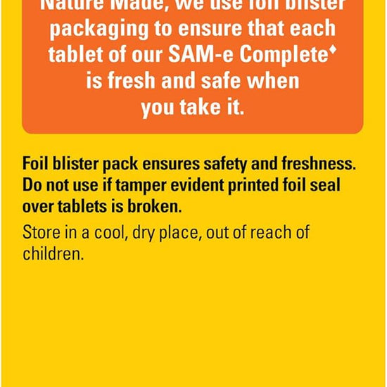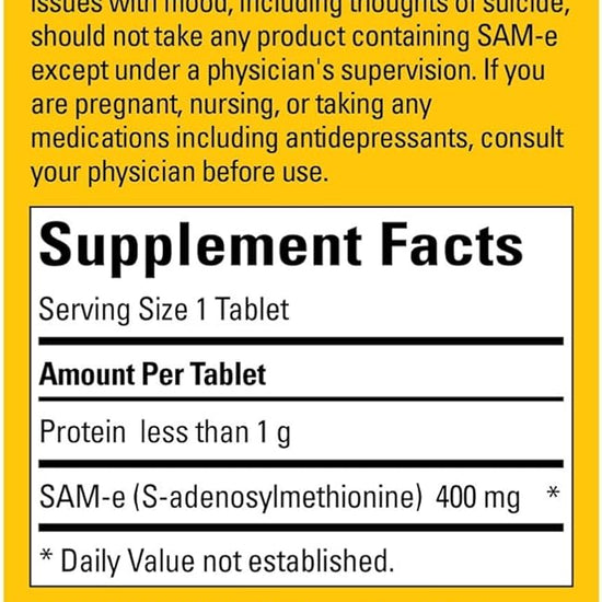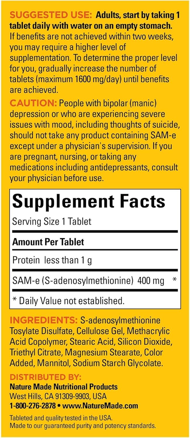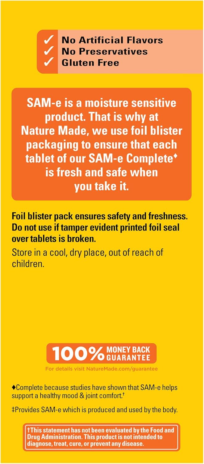 Boost your mood and joint health with Nature Made SAM-e Complete 400 mg tablets. This dietary supplement supports emotional wellbeing while providing a source of sulfur for joint comfort. Sourced from high-quality ingredients and containing no artificial flavors or preservatives, this gluten-free supplement is recommended by pharmacists. Start feeling your best by taking one tablet daily with water on an empty stomach. *#1 Pharmacist Recommended Vitamin & Supplement Brand.