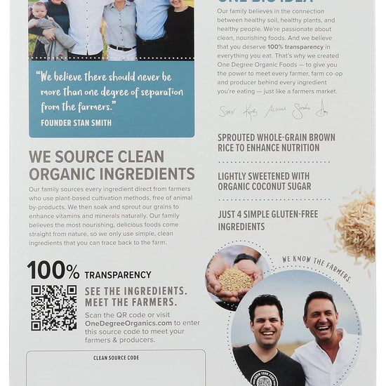 Discover the delicious and nutritious One° Cereal Rice Crisp Brown, made with organic sprouted whole grain brown rice and sweetened with organic coconut sugar. With added tocopherols (vitamin E) for an extra boost, enjoy the tasty and healthy benefits of this crunchy cereal in every spoonful.