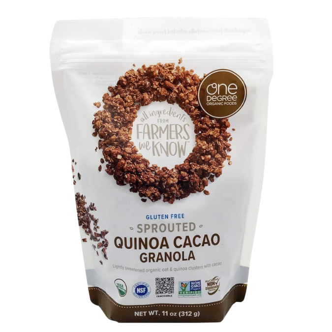 Boost your morning with a bowl of One Degree Granola Quinoa Cacao. Made with sprouted gluten-free organic oats, organic quinoa, and cacao powder, this granola is not only delicious but also packed with beneficial nutrients. With no added refined sugars and only organic ingredients, it's the perfect choice for a healthy and hearty breakfast.