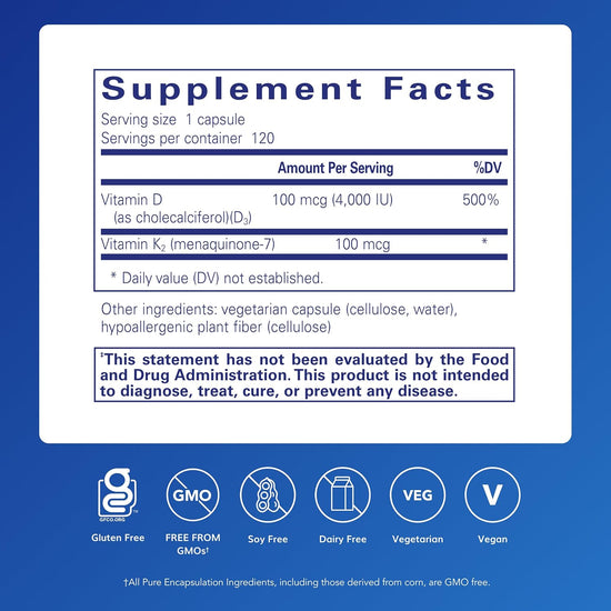 Pure Encapsulations Vitamin D3 & K2 | Bone and Vascular Health Support - 120 Capsules