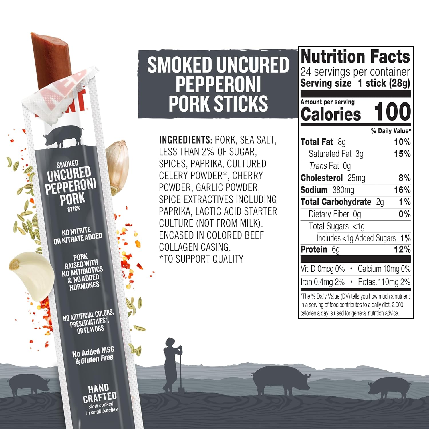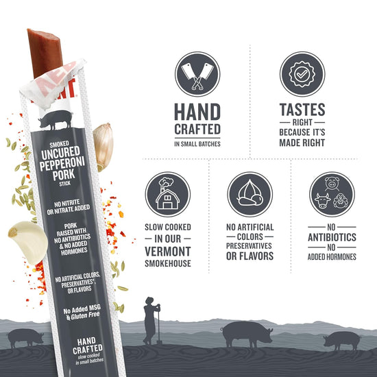 Snack Sticks by Vermont Smoke & Cure – Uncured Pepperoni Pork - 1oz Jerky Stick – 24 count carton