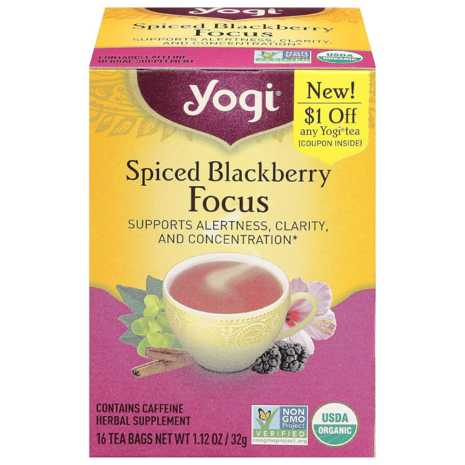 Expertly crafted with a proprietary blend of herbs, Yogi Focus Spiced Blackberry Tea promotes concentration and mental clarity. Fueled by organic ingredients like black tea, hibiscus, cinnamon, and licorice, this tea contains a powerful combination of flavors that will leave you feeling refreshed and focused. Contains 16 tea bags per unit.